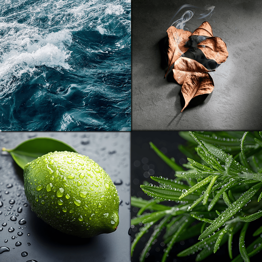Une fragrance énergisante où la vivacité du citron vert se mêle aux embruns marins pour une sensation de fraîcheur absolue. Le parfum s’enrichit ensuite de feuilles fumées évoquant une chaleur subtile, avant de s’apaiser sur un romarin vert et aromatique qui apporte une profondeur herbacée et raffinée.